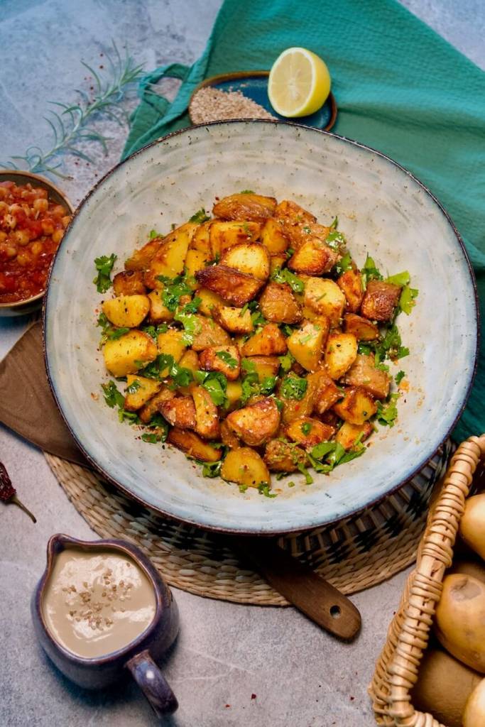 Batata Harra is often served as a side dish, so you got plenty of pairing options. My go-to combination is Batata Harra with a saucy chickpea dish, naan covered with garlic oil, and a drizzle of tahini sauce. It also works well alongside stews or salads to balance the spice and bold flavors. Of course, you can enjoy it on its own with a sauce of your choice, or simply as a very special, flavorful snack, no sauce needed!