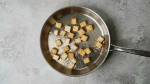 Wenn Sie es vorziehen knuspriger TofuBereiten Sie es jetzt zu. Sie können es bei mittlerer Hitze in der Pfanne braten, bis es von allen Seiten goldbraun ist, oder Sie können es in die Fritteuse geben, wenn Sie es nicht brauchen.