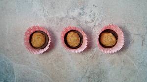 75 g der Schokolade schmelzen und jeweils etwas mehr als einen Teelöffel in jede Papierförmchen geben. Die Förmchen vorsichtig schütteln oder neigen, damit sich die Schokolade gleichmäßig am Boden verteilt. Dann für etwa 10 Minuten in den Kühlschrank stellen, damit sie fest wird.