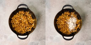 Die geröstete Gewürzmischung und die Kichererbsen unter die karamellisierten Zwiebeln rühren und alles zusammen weitere 2-3 Minuten kochen lassen. Dann einen Teil der Esslöffel Mehl (oder eine glutenfreie Alternative wie Maisstärke oder Hafermehl) und etwa eine Minute lang gut umrühren.