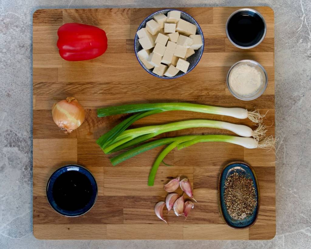 - Mix the remaining two tablespoons of cornstarch with 2-3 tablespoons of water. After removing the crispy tofu cubes from the pan and placing them on a plate, reheat some oil in the pan. Add the chopped garlic, sliced onions, and sliced red bell pepper. Cook on high heat, stirring frequently for about 5 minutes until they soften. After 5 minutes, add the soy sauce, syrup, and cornstarch water mixture in that order while stirring slowly.