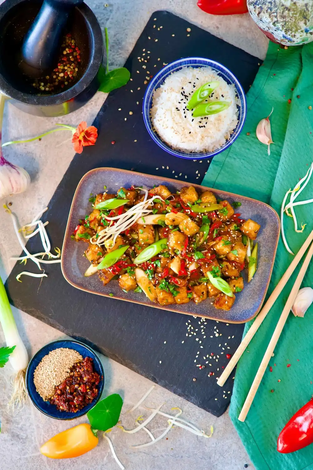 Pepper tofu is super versatile, so you can enjoy it with lots of different sides. I usually stick with rice, because it soaks up the peppery sauce perfectly. Bell peppers are my favourite vegetable to add, since their sweetness balances the heat so well. I also love topping it with fresh spring onions. Mushrooms are another great option if you want to bulk it up a little more, because they add an earthy depth that works beautifully with the sauce. For a change, you can also serve it with noodles, thick udon noodles give a hearty bite, while rice noodles are a great gluten-free choice.