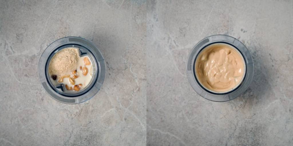 - Pour about half a cup of unsweetened plant milk into a blender. Add salt, pepper, one tablespoon of nutritional yeast, the roasted cashews and garlic, and the juice of half a lemon. Blend until smooth. If the sauce is too thick, add a little more plant milk until you reach a creamy consistency. Let the sauce rest in the fridge while you prepare the rest.