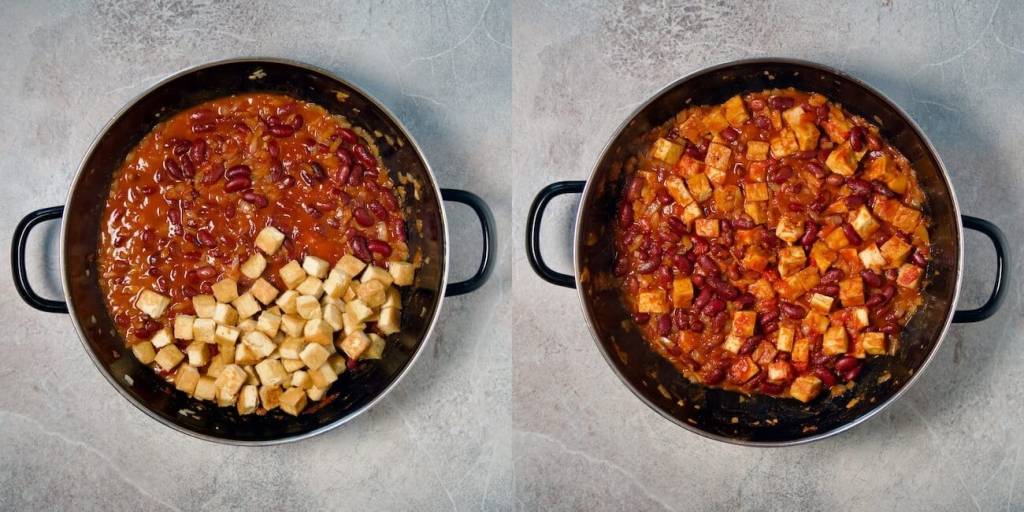 - Once the tofu cubes are golden and slightly crispy, remove them from the pan and set aside. If needed, add a little more oil to the pan, then add the chopped onions and the remaining three chopped garlic cloves. Sauté for about 5 minutes until they begin to soften and take on a nice color. Then add the beans, your spice mix, and the tomato purée. Stir everything well to combine.