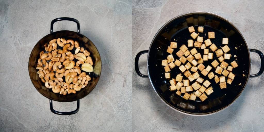 - Season the tofu cubes generously with salt and cook them in a lightly oiled pan over medium heat. Let them sizzle in the background while you prepare the sauce, stirring occasionally to get them evenly crispy.For the sauce, slice two garlic cloves lengthwise. Heat one tablespoon of olive oil in a small pot, then add the garlic and let it sizzle for 2–3 minutes. Reduce the heat to medium and add the cashews, roasting them for another 2–3 minutes. Keep an eye on them to avoid burning.